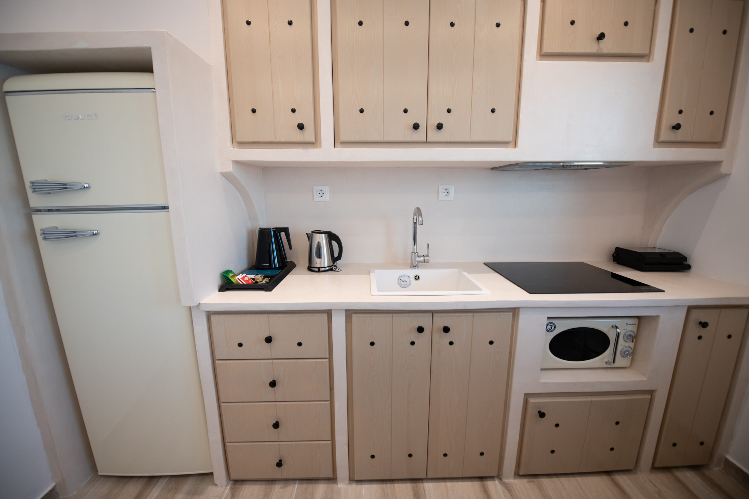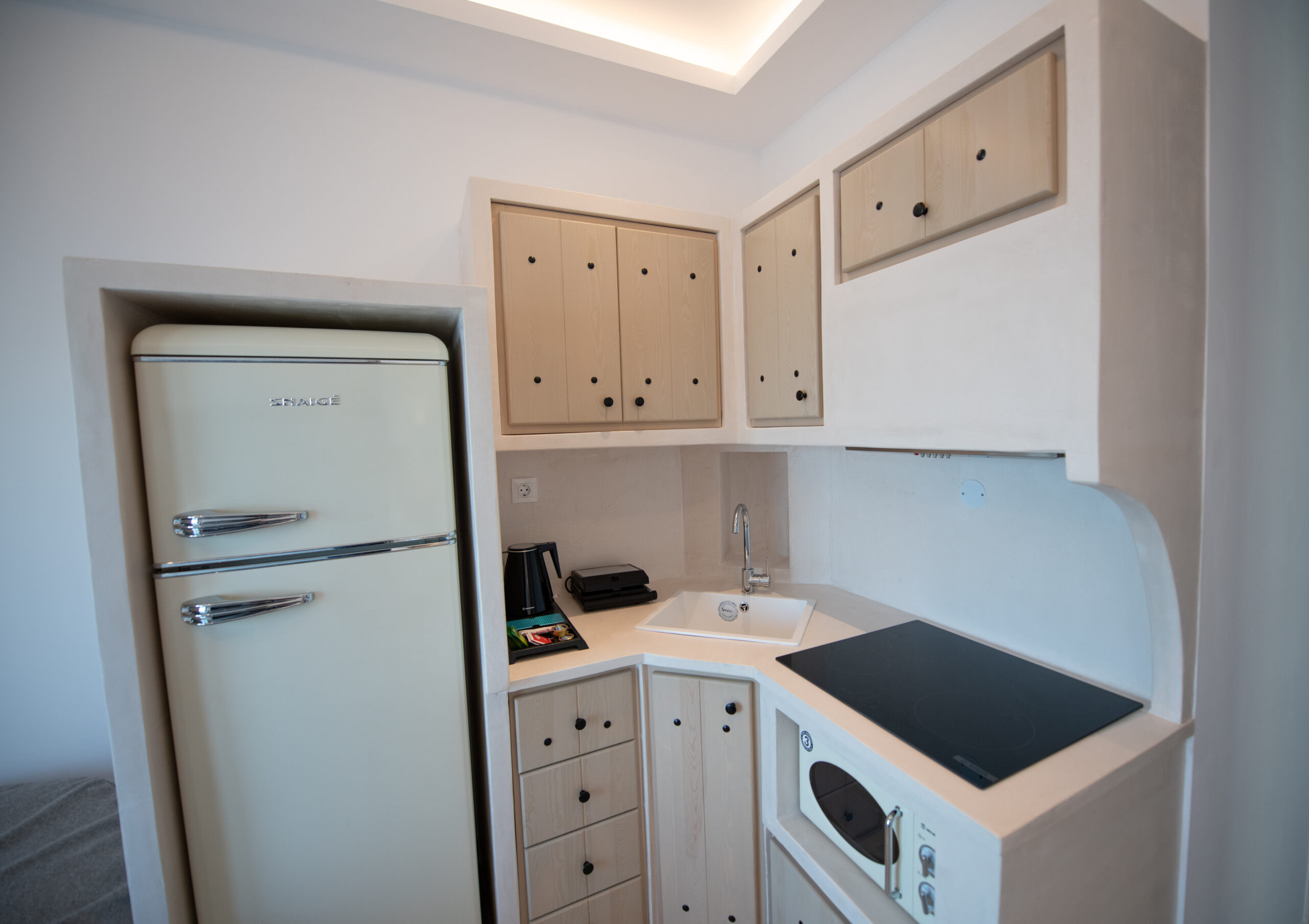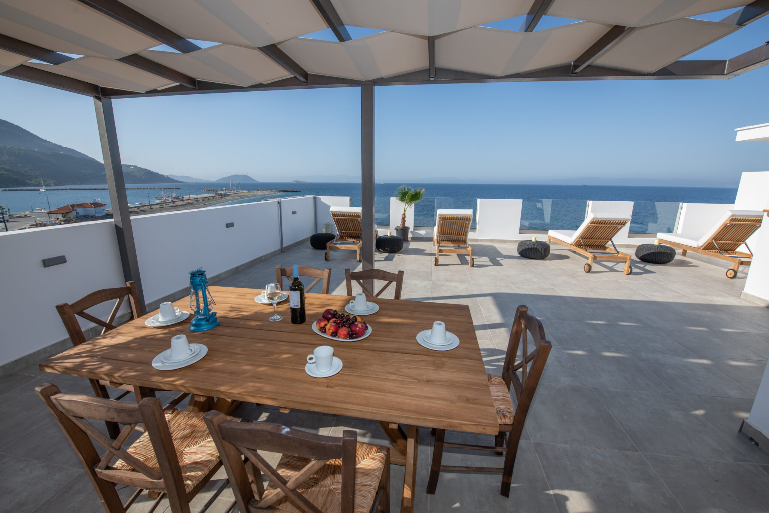 Each apartment includes a fully outfitted kitchen (with a fridge, microwave, coffee maker, etc.) and a private balcony featuring a sea view and sun loungers.