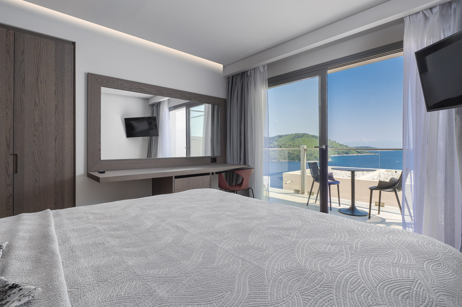 Situated on the southern coast of the island, the Adrina Grand Hotel rests between the ports of Glossa and Skopelos, each about 13 kilometers away. However, it also enjoys a convenient proximity to the charming village of Panormos and the picturesque beaches of Milia and Kastani, all within easy walking distance.