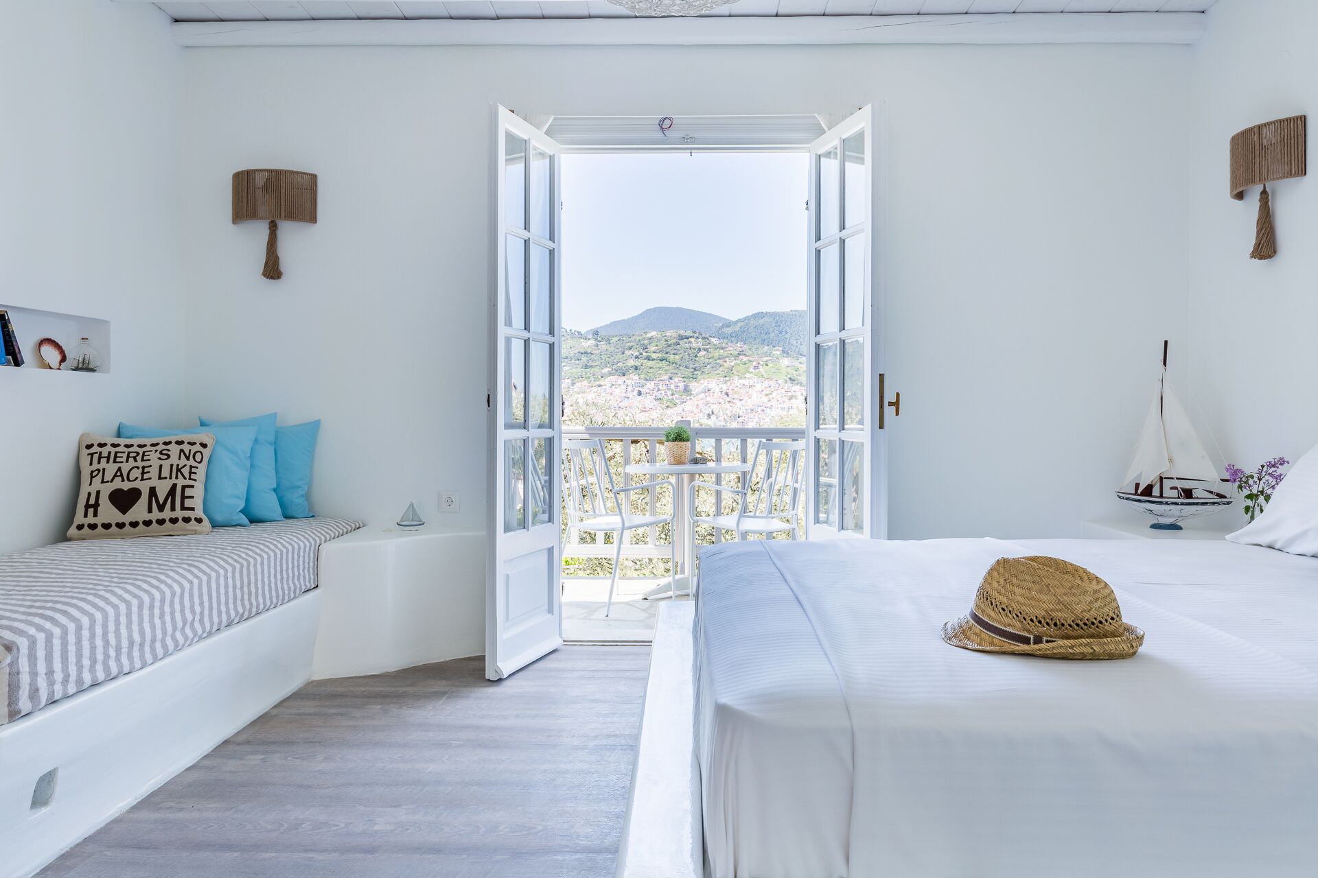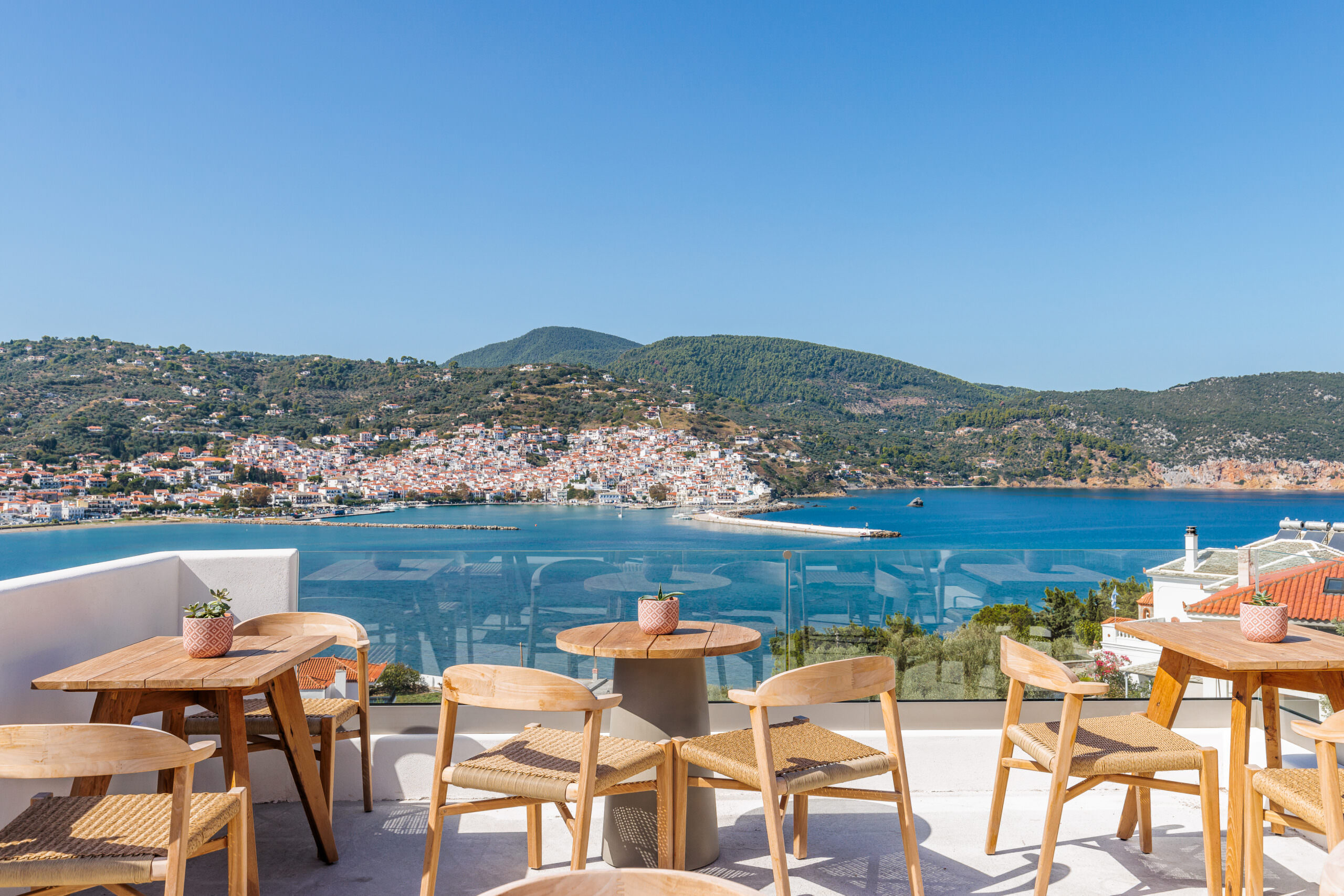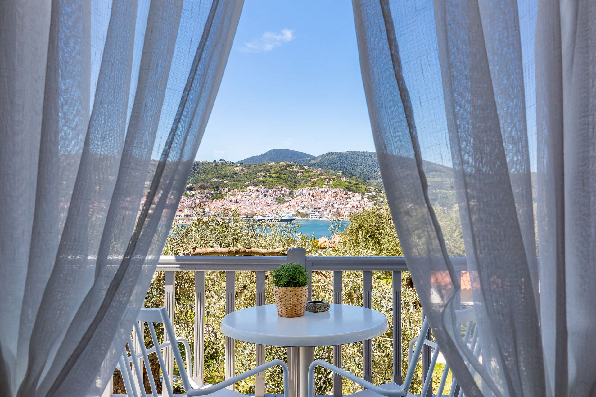Our outdoor areas feature furniture and amenities designed to make your stay a pleasant experience. The view of the deep blue sea, Skopelos Town, and our beautiful garden will captivate you. These elements make your choice to vacation in our area truly rewarding.