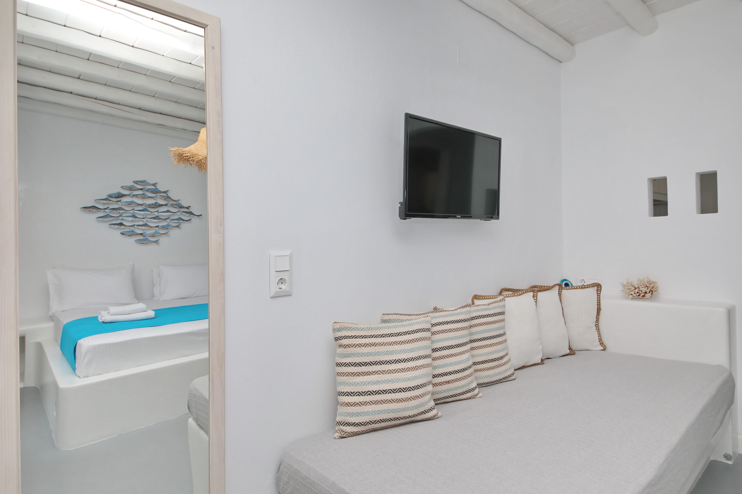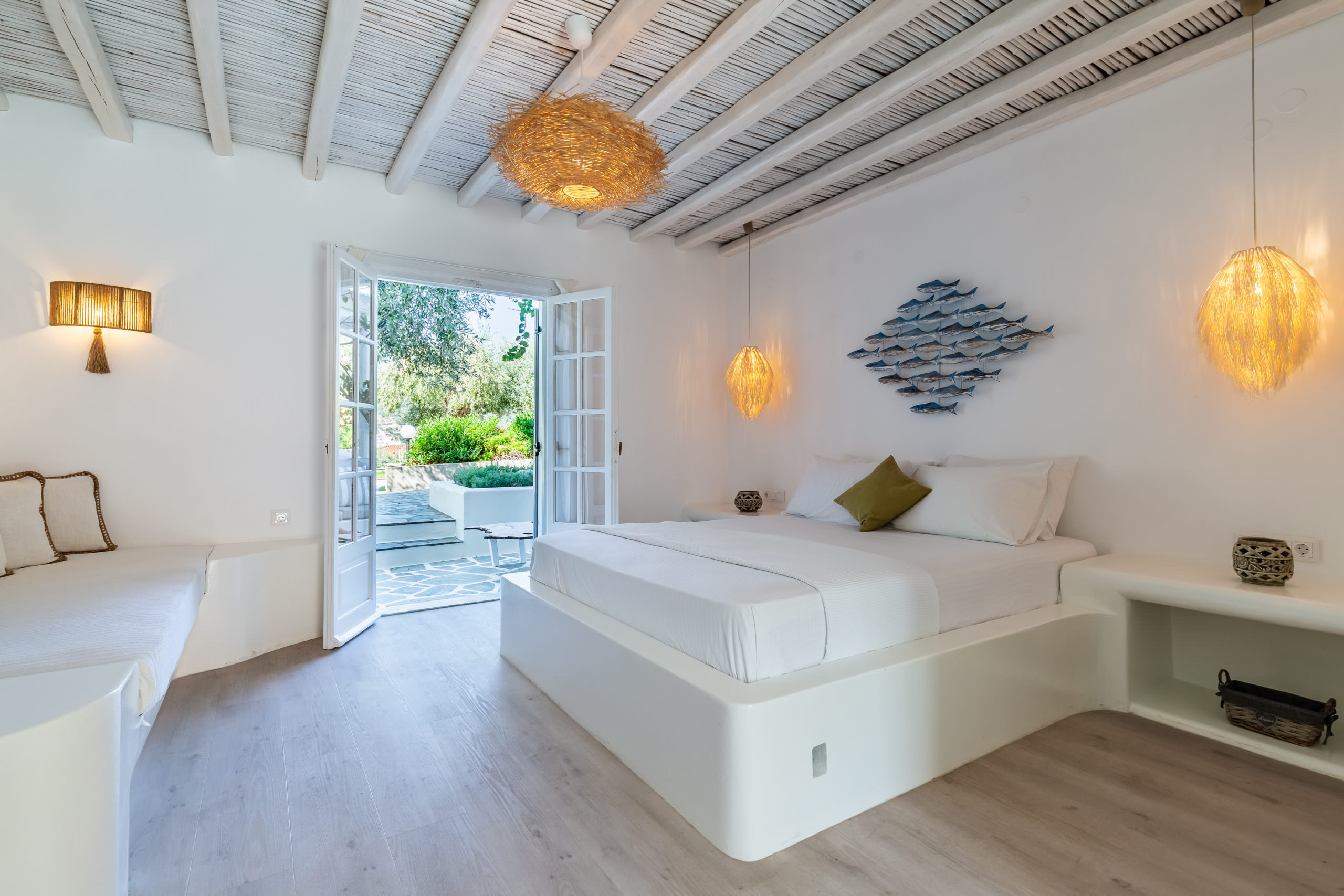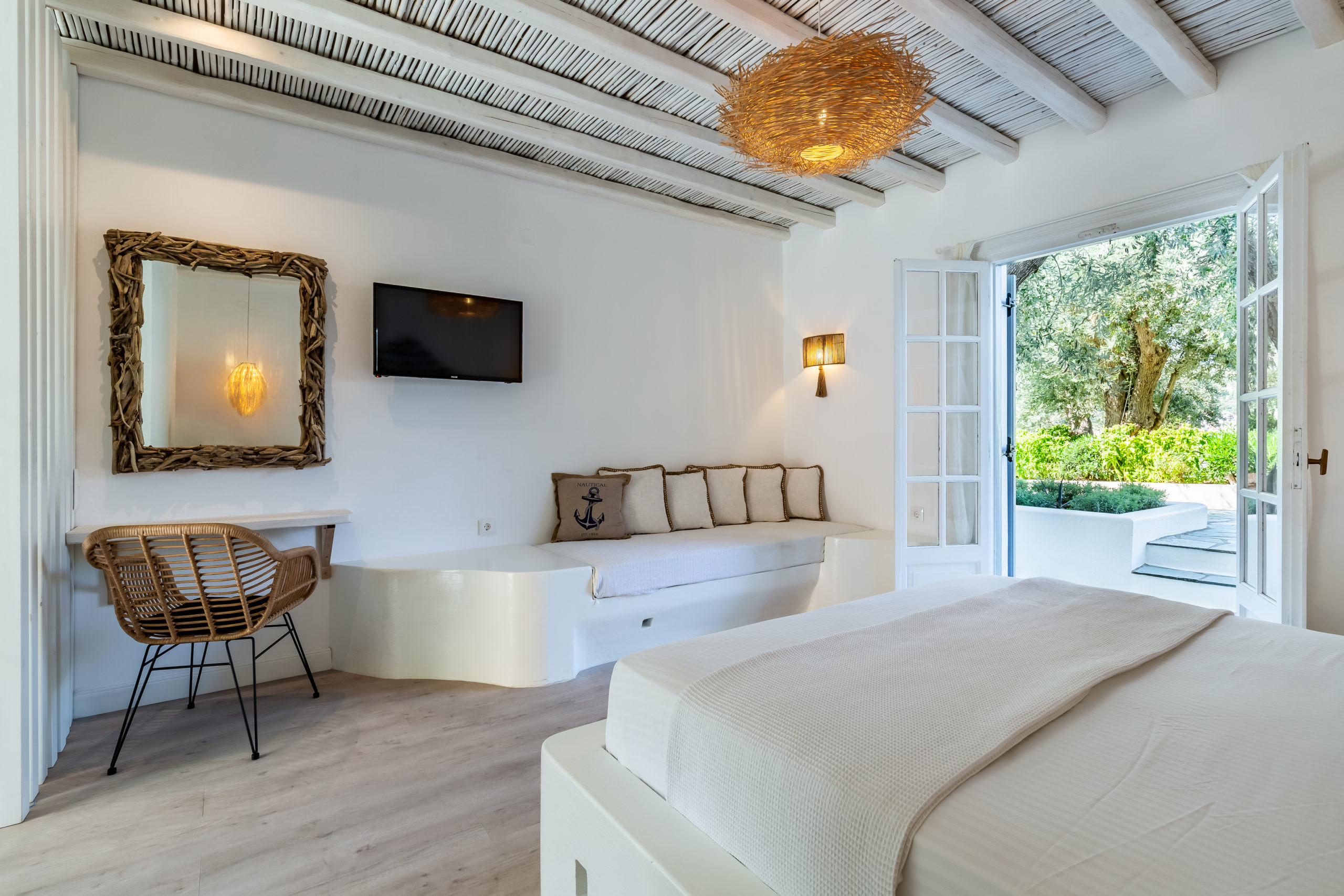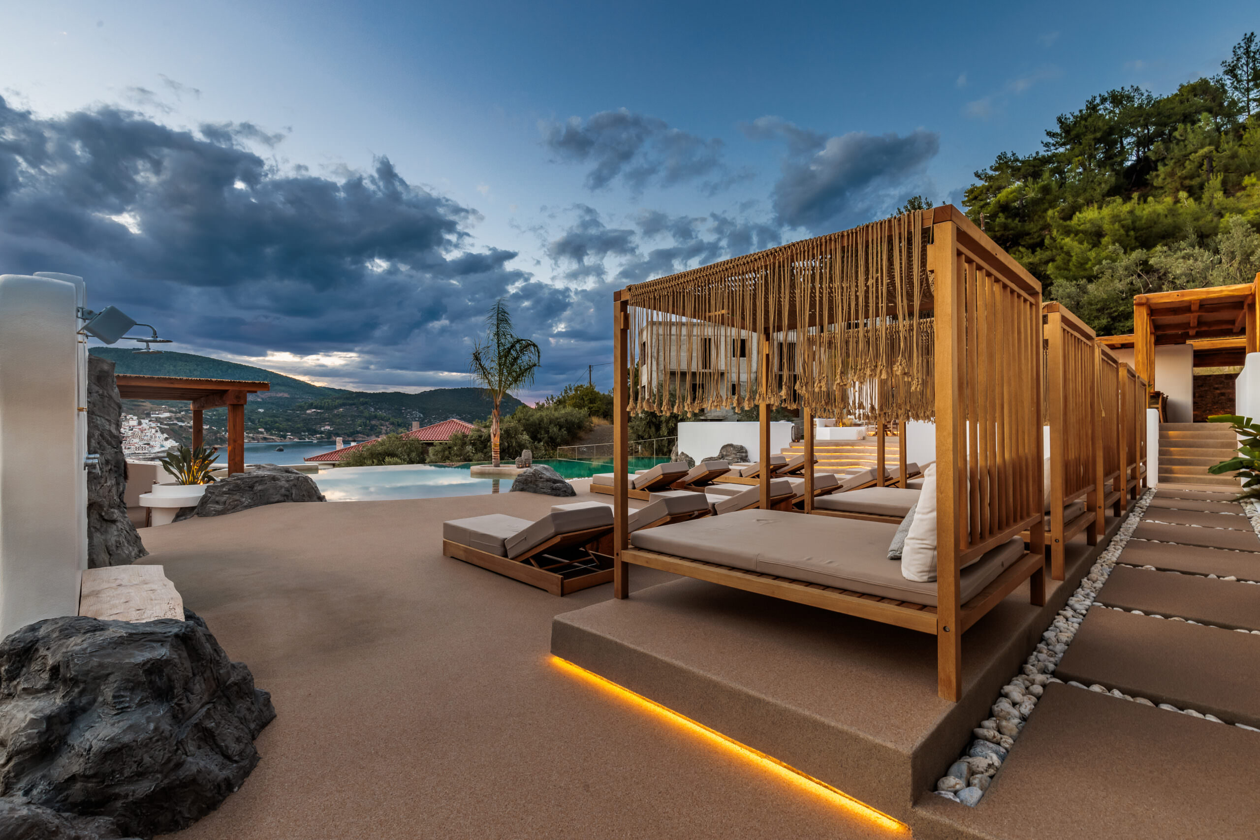 Our outdoor areas feature furniture and amenities designed to make your stay a pleasant experience. The view of the deep blue sea, Skopelos Town, and our beautiful garden will captivate you. These elements make your choice to vacation in our area truly rewarding.
