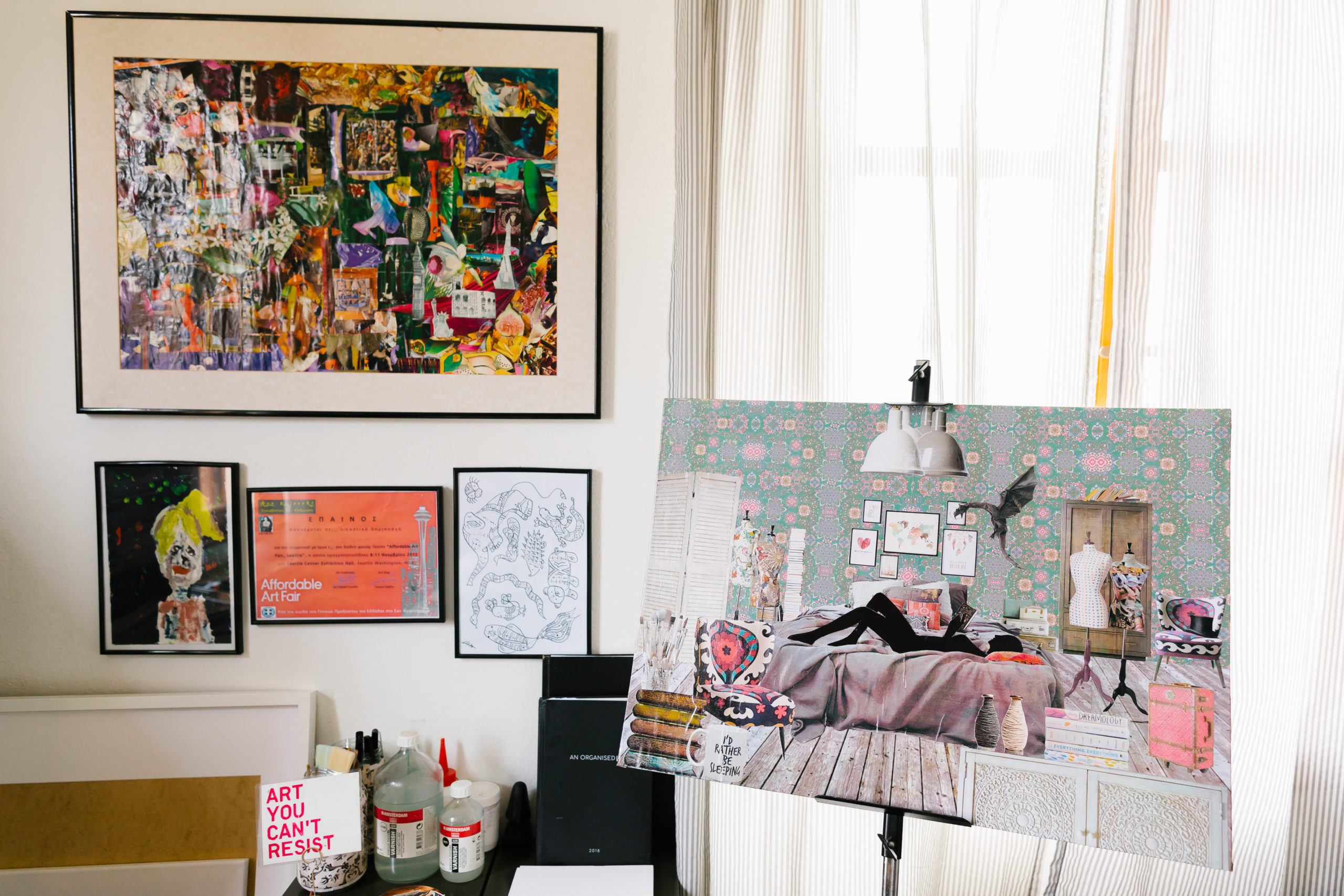 Athina Vlachaki is an artist from Skopelos, Greece. She discovered her passion for painting early on in life and at the age of 7, she excelled with her work “Wedding” in the children’s exhibition of UNESCO in France. This specific artwork can be seen ever since in one of the rooms of the City Hall of Paris. Athina Vlachaki organizes frequent exhibitions of her work both in Greece and abroad. Ever since 2011, she uses the method of collage on canvas as her expressive medium, blending seemingly dissimilar images into thematic works of art. In November 2012, she was awarded “Commendation” for her participation with only-collage pieces in association with Art Kolonaki and Art Way at the International Art Exhibition “Affordable Art Fair” that was held at Seattle Center Exhibition Hall, Seattle Washington, USA, under the auspices of Greek General Consulate in San Francisco. With the sentimentality and adaptability of the female nature in mind, she creates intricate journeys of the womanly figure in odd worlds and different times, blurring the line between reality and fantasy. Every artwork and card postal is a message, with an ever-female sender and the artist’s signature in a stamp, to all art lovers across the world.