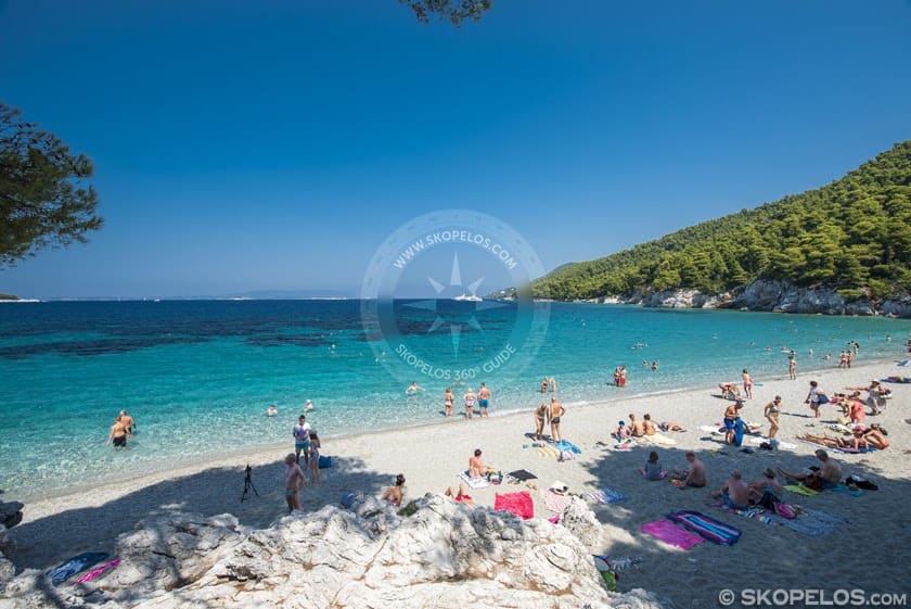 West coast, the "Mamma Mia" beach. 15 km from Skopelos Town. Last 500 m unpaved.