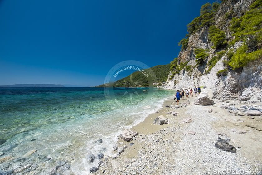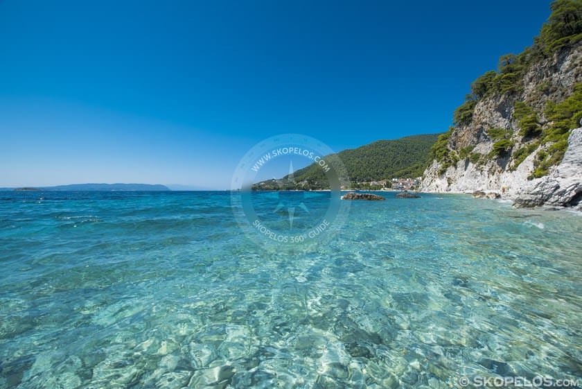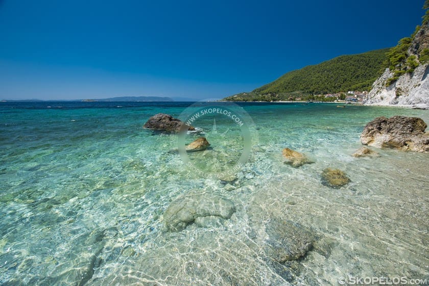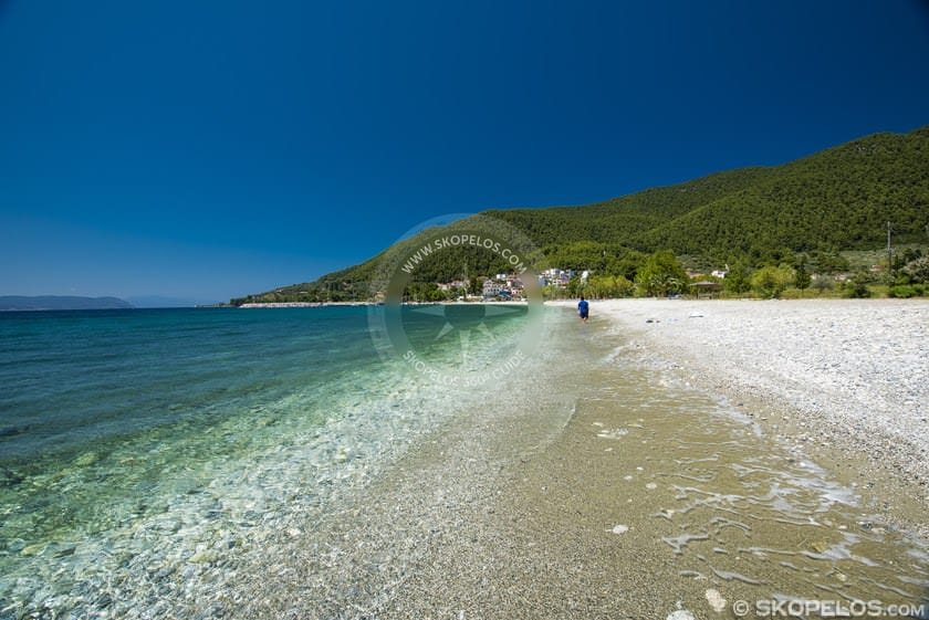 Elios Beach is about 18 km from Skopelos Town and port.