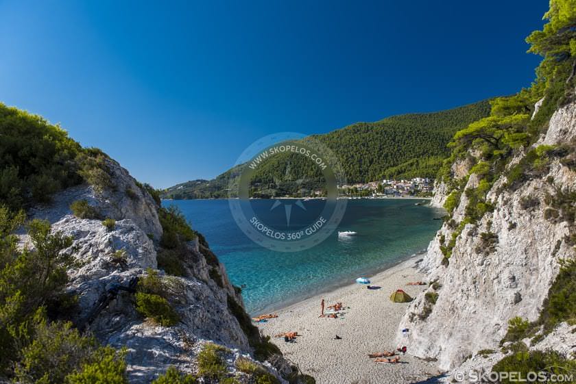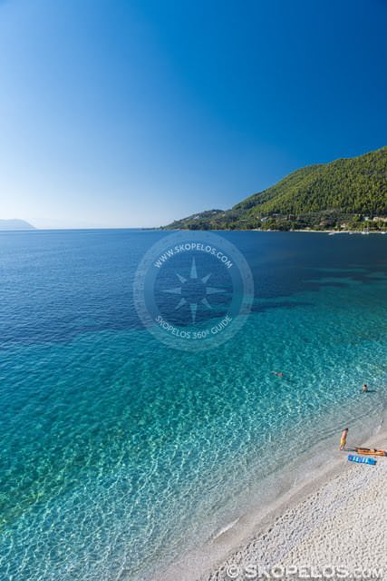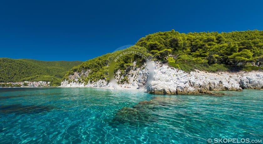 Hovolo is a beautiful exotic beach with fine sand, stunning white rocks, and crystal clear aquamarine waters framed by a pine forest. It is located in the village of Neo Klima-Elios on the west side of Skopelos. Hovolo Beach, due to its enchanting landscape, was included in the Telegraph’s list of the 17 most beautiful beaches in Greece. It is not easily accessible because you have to get through a rough trail and some rocks that are in the sea. The further we get, the more beautiful the bottom of the sea is.