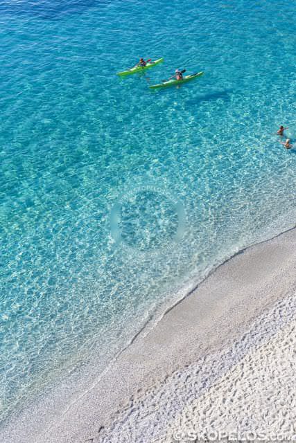 Moreover, the green pine trees rooted in the white rocks create a cool shade. The white fine sand along with the turquoise waters make up the exotic beauty of the beach. The rocks that surround it are ideal for bold dives. Hovolo Beach is not organized, so you should have water, food, and umbrellas since Elios is 700 meters away. However, Mandalaki Cafe is next to the beach.