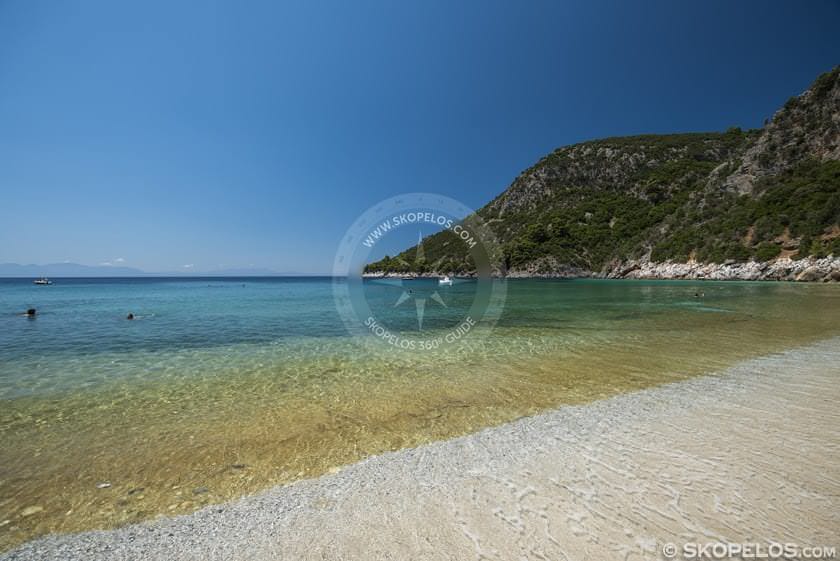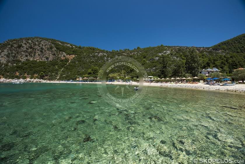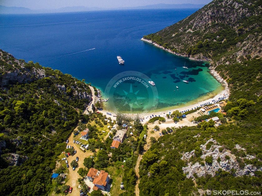 South coast, 8.7-10 km from Skopelos Town. Just past Agnontas, paved road access.
