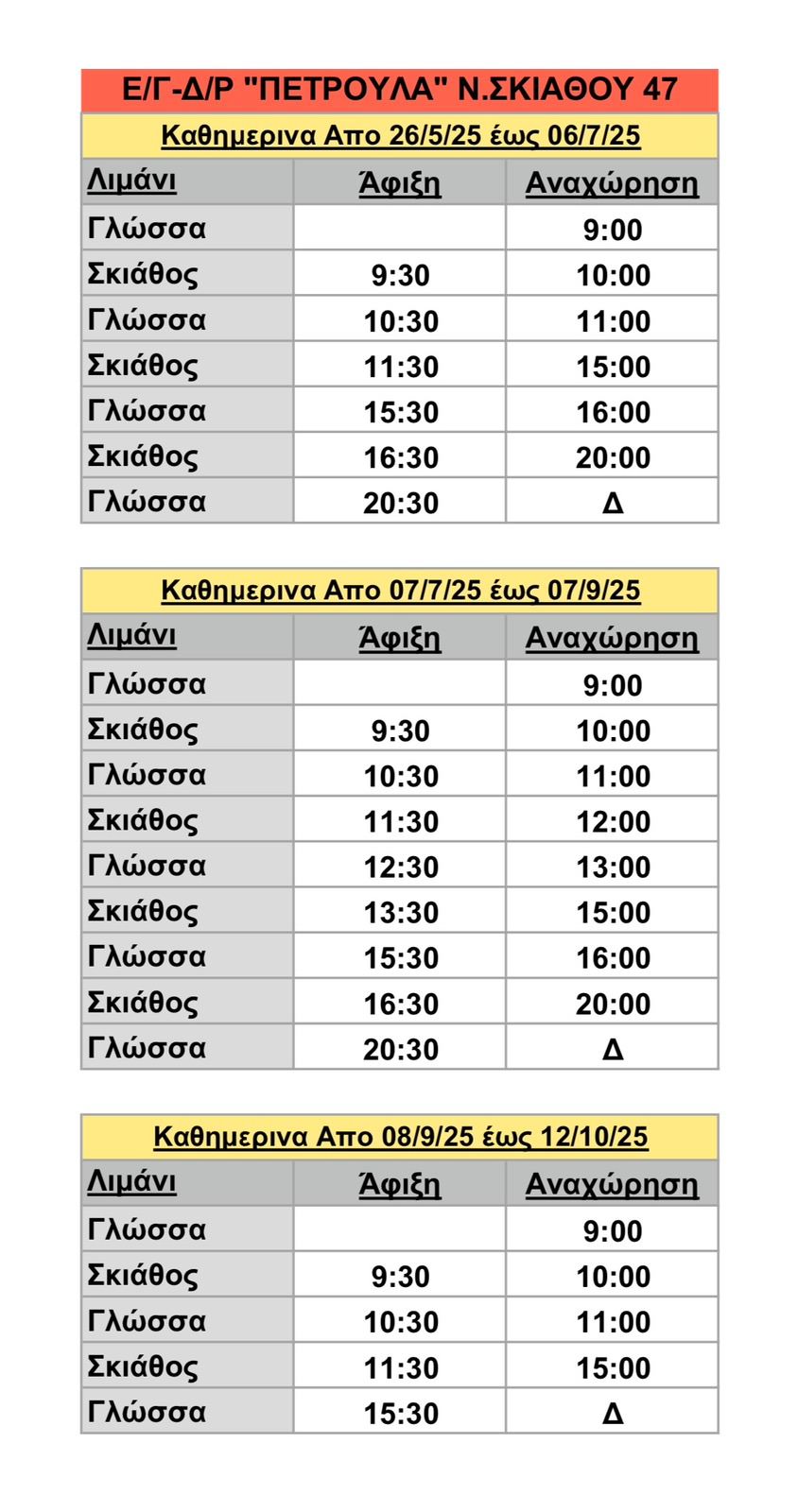 Από Γλώσσα, Σκόπελος προς Σκιάθο: €15.50Δρομολόγια Πλοίου «Πετρούλα»