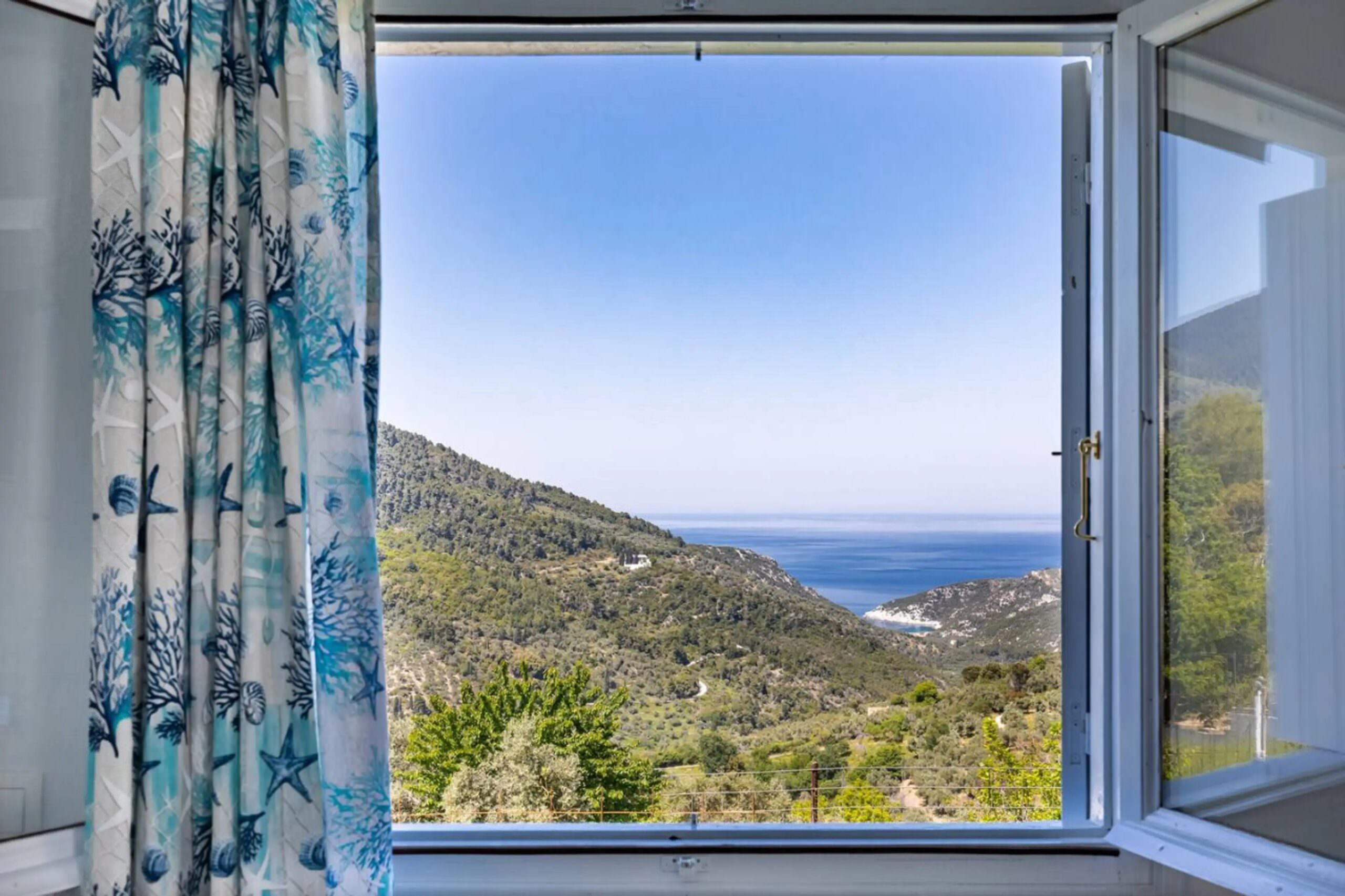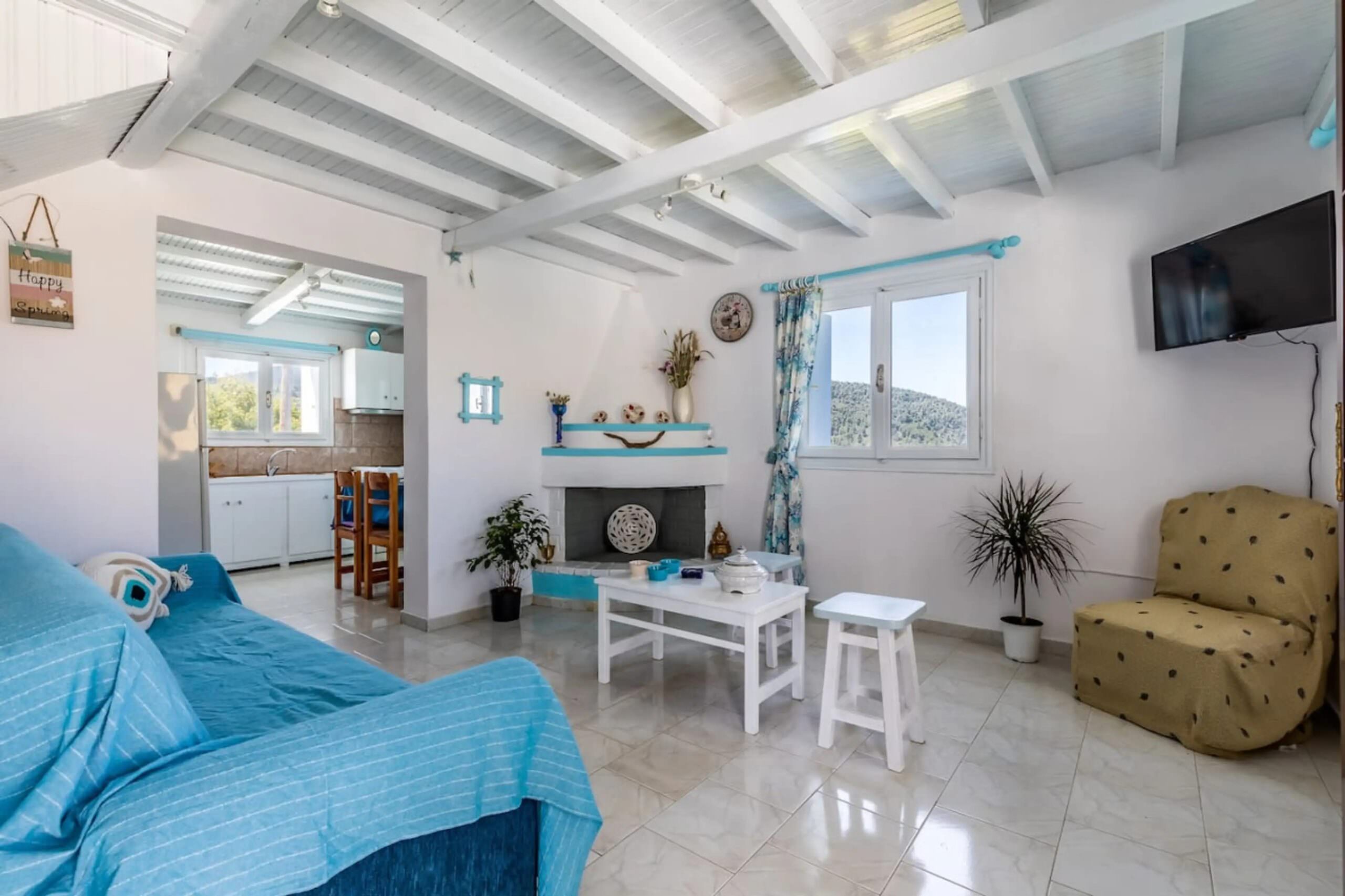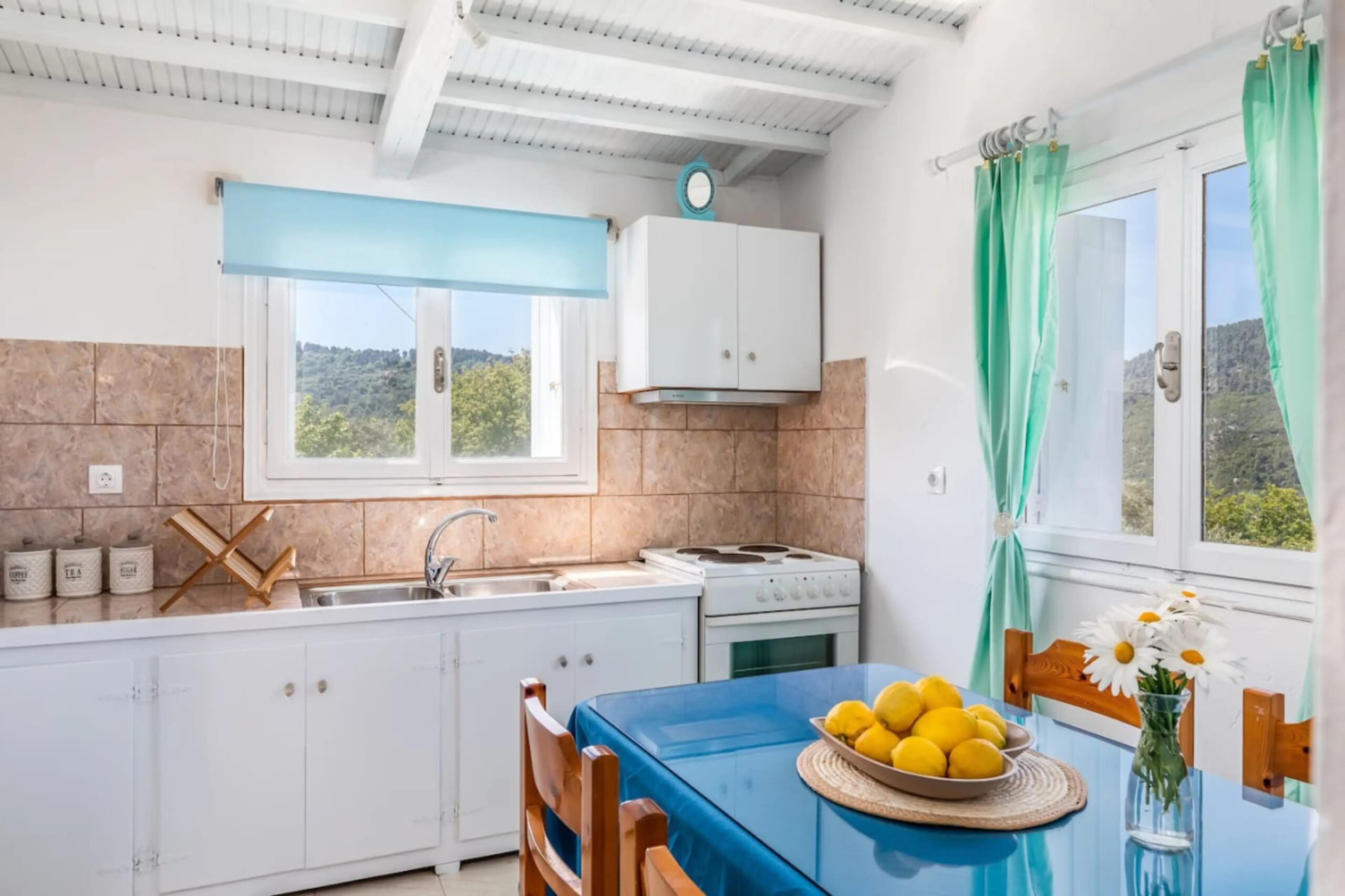 The country house spreads over two floors, combining practical living with island charm. On the ground floor, guests will find a cozy living room with a TV and a large window overlooking Glysteri Beach. The fully equipped kitchen sits next to the living area, allowing you to prepare meals while taking in the peaceful mountain views. The bathroom, located nearby, comes with a shower.