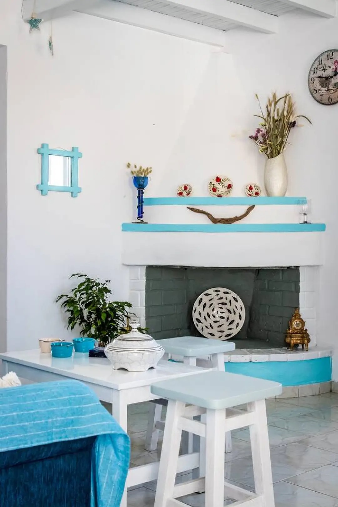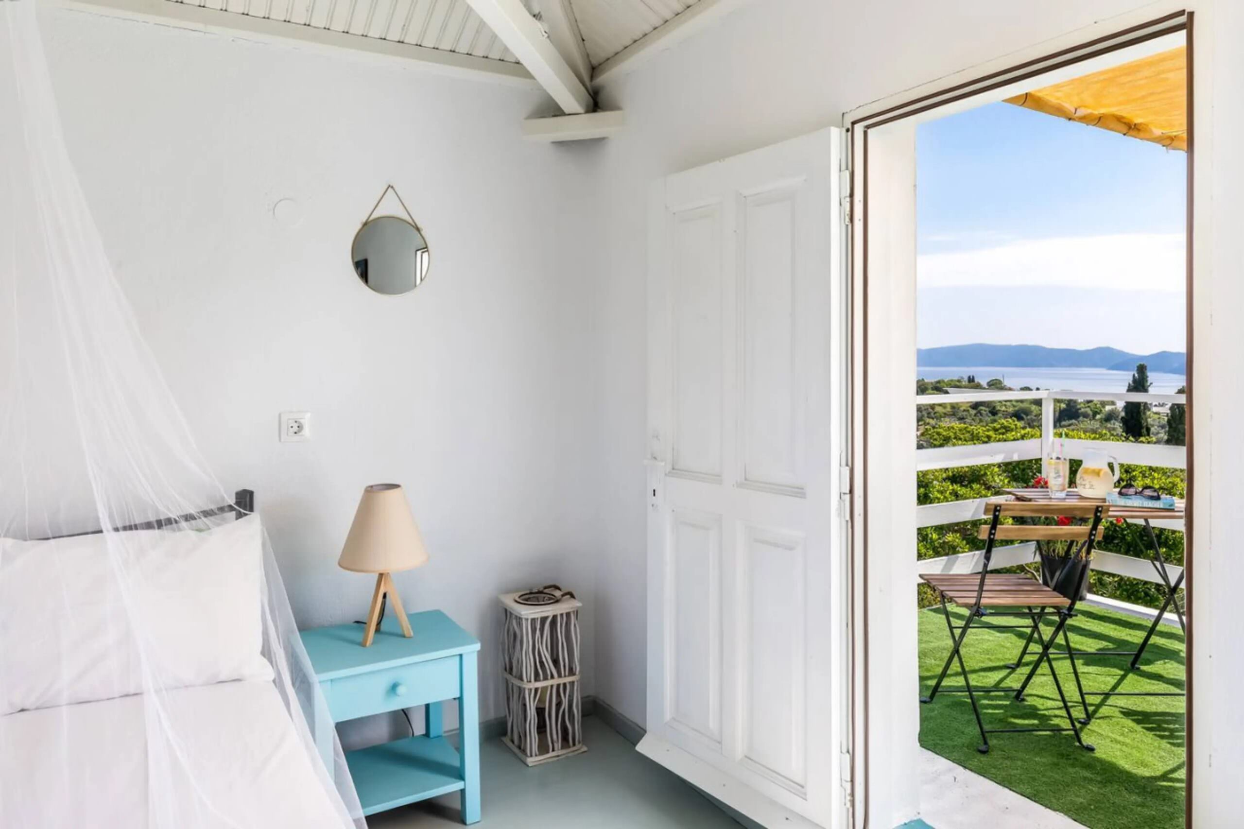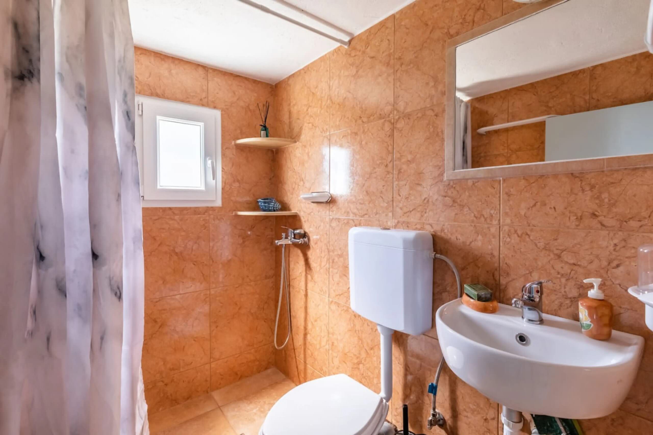 The country house spreads over two floors, combining practical living with island charm. On the ground floor, guests will find a cozy living room with a TV and a large window overlooking Glysteri Beach. The fully equipped kitchen sits next to the living area, allowing you to prepare meals while taking in the peaceful mountain views. The bathroom, located nearby, comes with a shower.