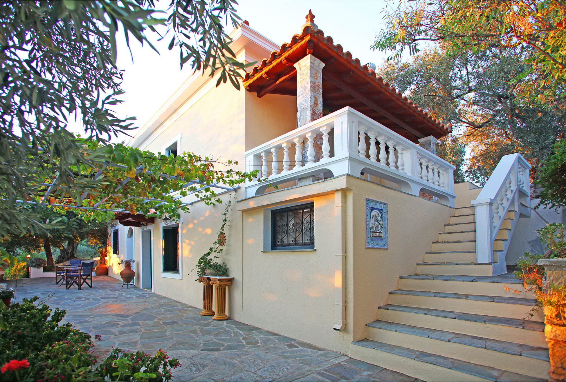 The outside area of the house is spectacular. There is a swimming pool on a patio with sun loungers , umbrellas as well as outside furnitures. There are also bbq facilities in Potami House Skopelos. The lush garden of the Pool Villa Potami Skopelos is amazing. There are many olive, pine and fruit trees.