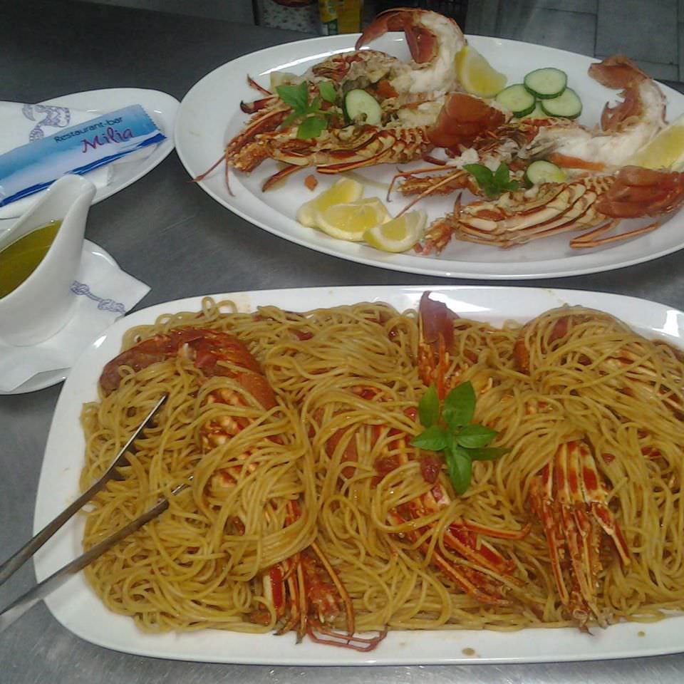 On the menu, there are a lot of choices since it includes cooked dishes, original starters, cool salads, grilled meats, as well as fresh fish, seafood, and special plates with lobster. As raw materials, the owners use fresh vegetables and local products. The fish is daily fresh, and the specialities of Milia Restaurant are lobster spaghetti and lobster giouvetsi.